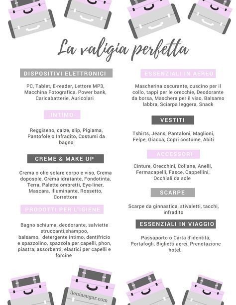Nei giorni precedenti, stilate una lista di cose da portare con voi nel viaggio in base alla vostra destinazione, che sia il mare, la montagna o la città, per essere certi di non dimenticare nulla. Vi consiglio, inoltre di controllare il meteo, per essere sicuri di portare i capi adatti alle temperature che troverete.